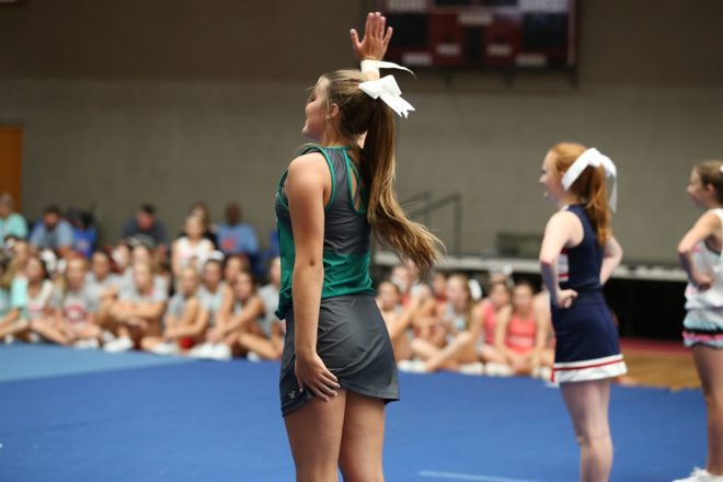 After everyone in your group performs their jump, the announcer will ask you to get set for your cheer. If you have poms, you will pick them up during this time. The announcer will call from the mic “TIGER XX NATION”. You have the option to say Tiger or your own school mascot throughout the cheer!